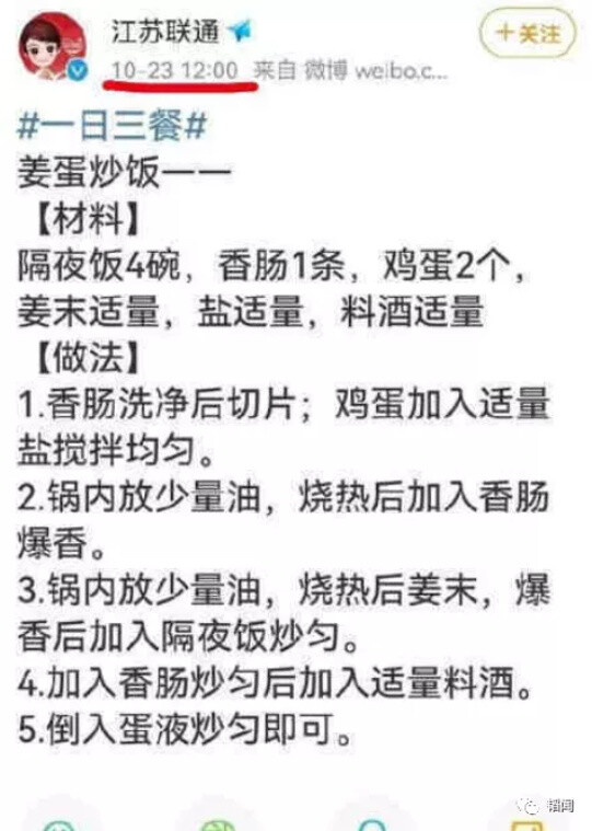 昨天中午12时,江苏联通的官微发了一条微博,玩儿起了“蛋炒饭”。记着,昨天这个日期的特殊性。