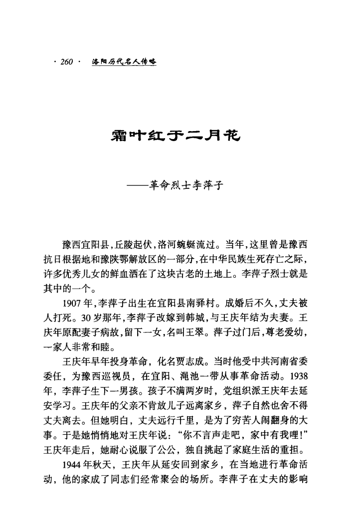 走进宜阳县韩城镇革命历史纪念馆,有一副黑白画像特别引人瞩目,画像中一位中年妇女面容清秀、眼神坚毅。她叫李萍,生于1907年,1937年嫁给同乡王庆年。王庆年1930年加入中国共产党,是中共宜阳县第一个党支部成员,历任中共区委委员、县委委员、副县长。