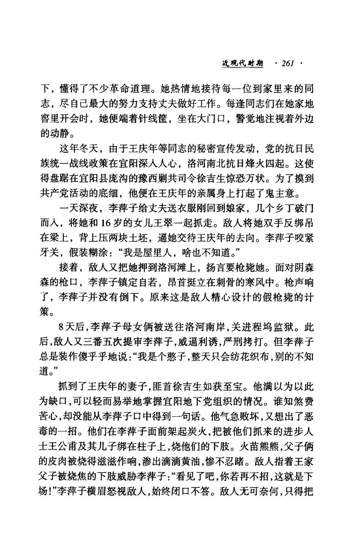 1944年豫西沦陷,王庆年从延安回到家乡参加抗日活动,负责宜阳县抗日民主政府日常工作。盘踞在宜阳的国民党反动派,打探到消息,于1945年2月的一个深夜,将李萍和16岁的女儿王翠抓走,他们把李萍双手反绑,吊在屋梁上,背上压上重重的土坯。李萍忍着剧烈疼痛,始终只有一句话:“俺是屋里人,啥也不知道。”敌人连续审讯了她7个昼夜,死去活来的李萍始终不开口。