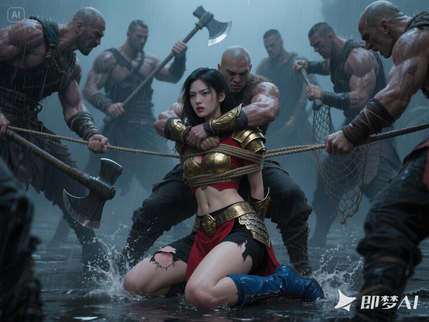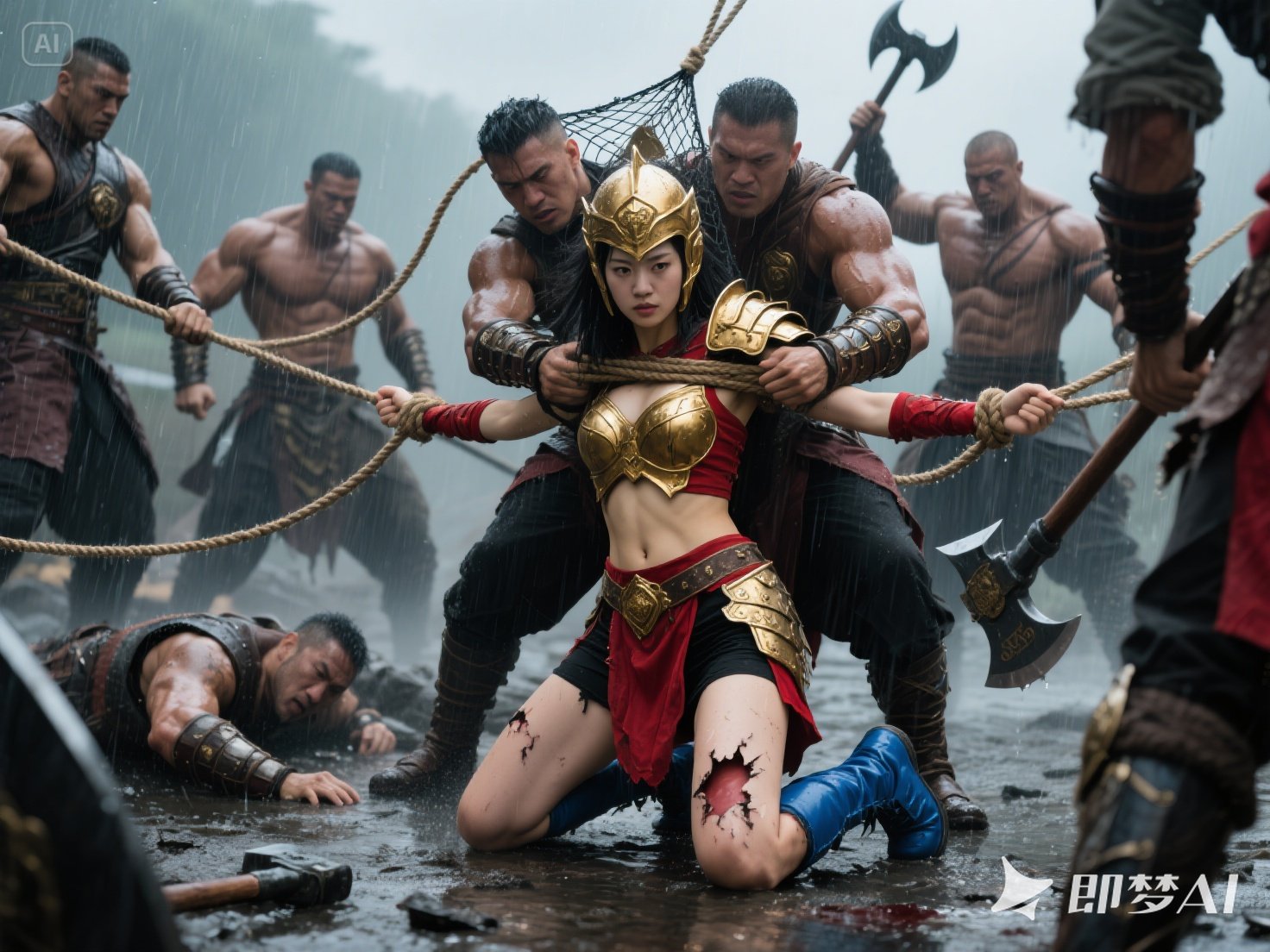 jimeng-2025-05-22-19-天下着雨,这里正在发生一场殊死的战斗,一位亚洲面孔的美丽、英武的女将军,穿着金色盔甲,红色露脐战袍,黑色短裤,兰色靴子,战袍和短裤破损了,露出姑娘细嫩的皮肤,...