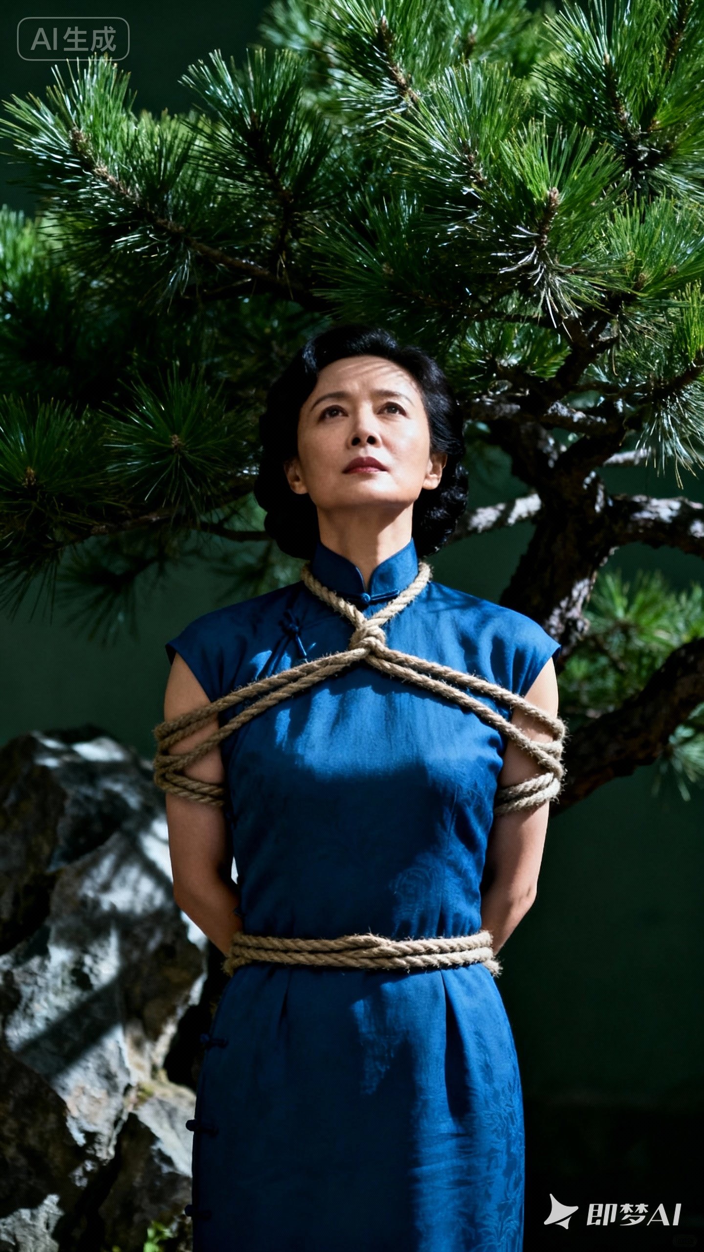 第一: 用真实的五花大绑人物, 替换她的衣服和容貌, 保留绳子更容易实现五花. 比如用即梦4.5提示词: “把图1女子的表情改成闭眼沉睡歪头, 双手反剪在背后, 背景改成图2的背景, 衣服改成图2女子的衣服, 但完全保留图1女子身上的细绳” , 最后生成结果很多, 反复抽卡, 抽到理想的卡之一就是下图: