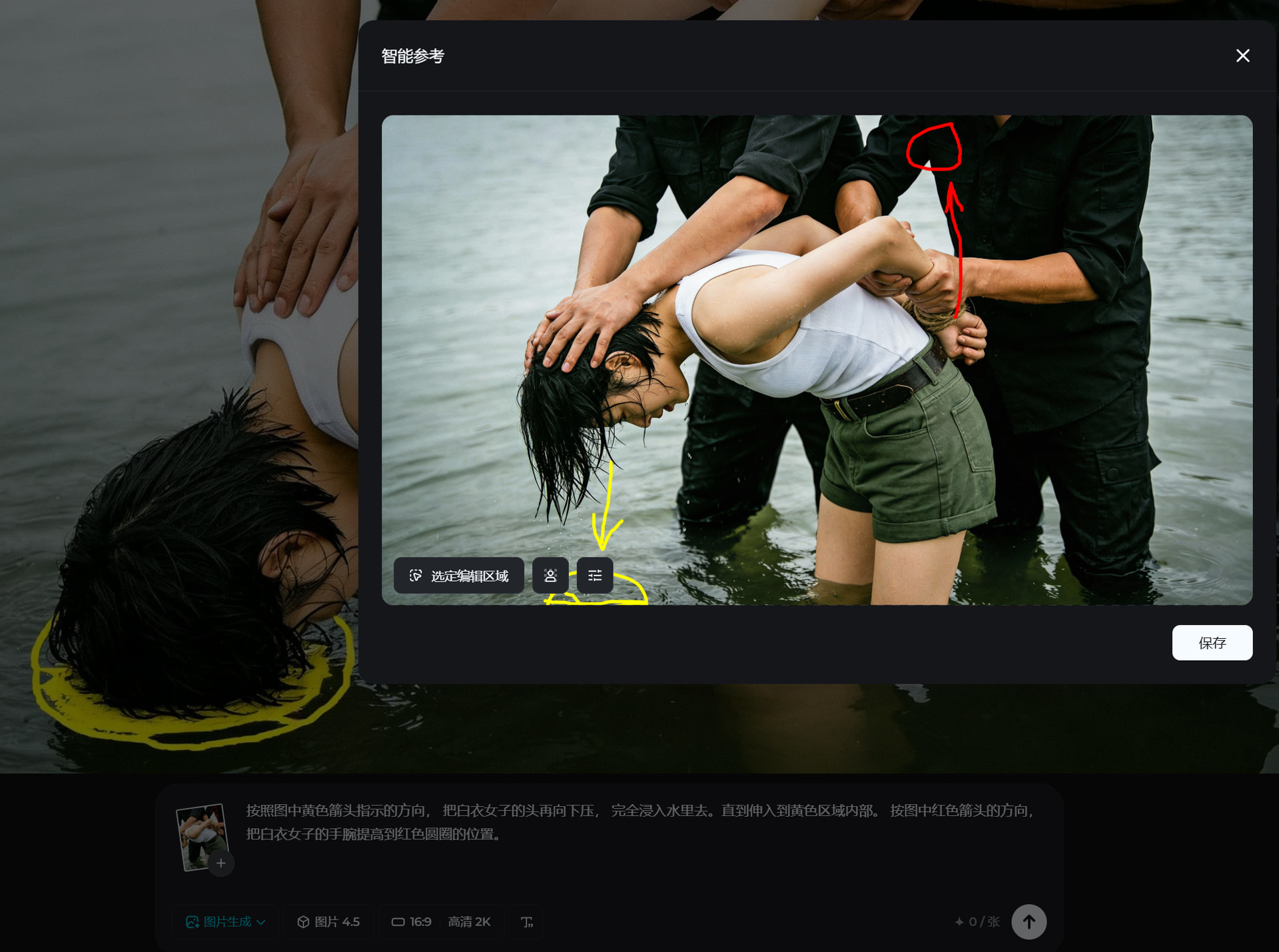 第二: 只是缺少一点点的地方, 比如脖子或胳膊缺绳环, 用图上做标记的方法, 用Nano banana pro(推荐) 或 即梦4.5 进行精确修改. 提示词: "把红线线条处变成绳子,红色小圆圈是个绳结“